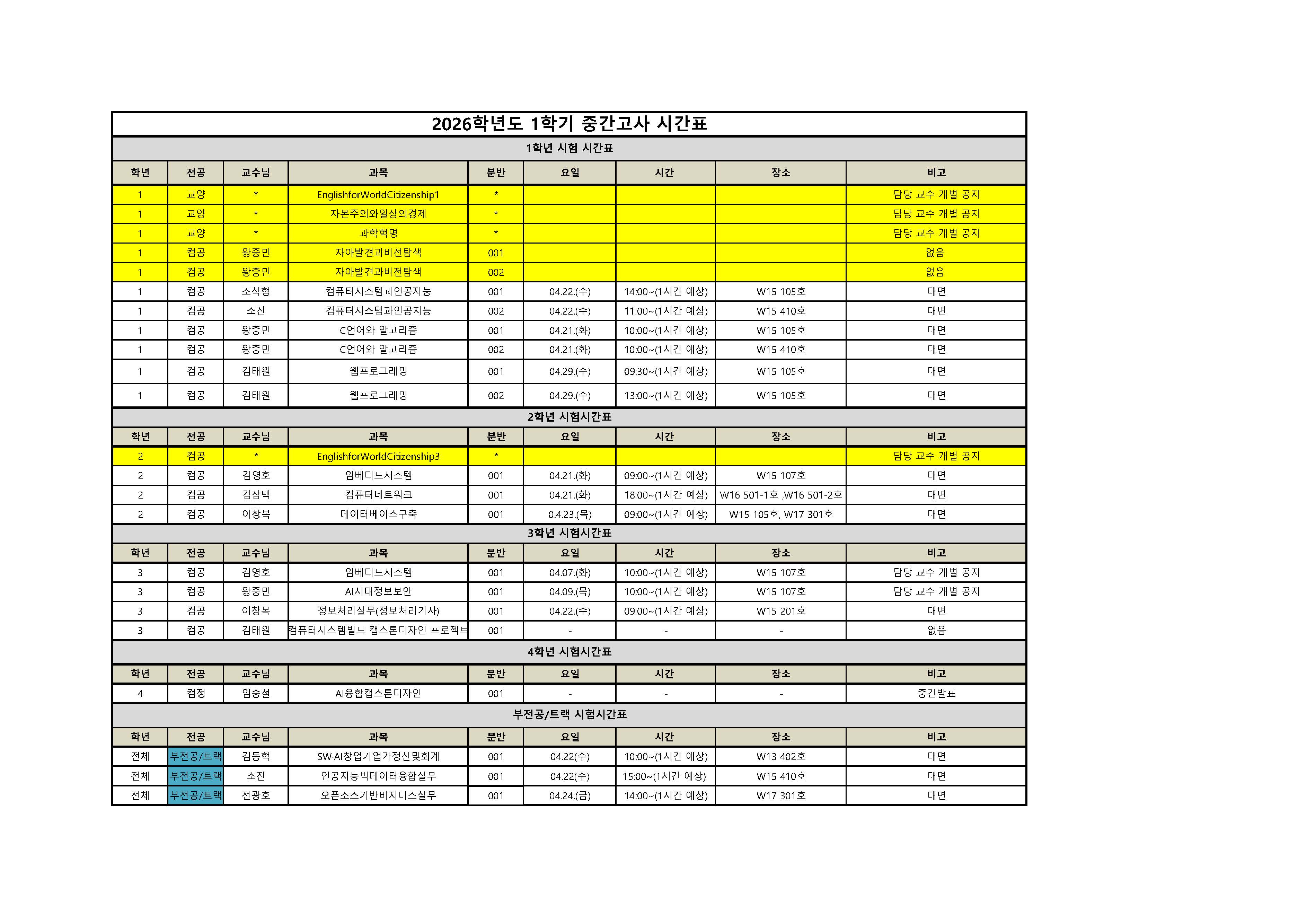 커뮤니티 공지사항 학과뉴스 포토갤러리 재학생 Q&A 자료실 복학생 커뮤니티 공지사항Home커뮤니티공지사항 2026학년도 1학기 수시평가 시간표 공지 작성자 : 학과관리자 | 작성일 : 2026.04.14 | 조회수 : 76 첨부파일 2026학년도 1학기 중간고사 시간표 공지.jpg 2026학년도 1학기 중간고사 시간표 공지.pdf 목록 이전글 2026학년도 1학기 수강철회 안내 다음글 2026학년도 1학기 소수집단(다문화가정, 북한이탈주민) 현황 파악을 위한 안내