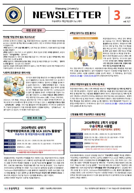 커뮤니티 공지사항 학과뉴스 포토갤러리 재학생 Q&A 자료실 복학생 커뮤니티 학과뉴스Home커뮤니티학과뉴스 2026년 3월호 우송취업 뉴스레터 작성자 : 학과관리자 | 작성일 : 2026.02.27 | 조회수 : 4 1. 대 상 자 : 해당 학과 전체 재학생. 2. 게 시 위 치 가. https://career.wsu.ac.kr 나. 학생역량통합관리시스템(Sol-Dream+)홈페이지/커뮤니티/공지사항(2026년 3월호 우송 취업뉴스레터). 첨부파일 뉴스레터.JPG 2026년 3월호 우송취업 뉴스레터[1].pdf 목록 이전글 이전 글이 없습니다. 다음글 2026년 02월호 우송취업 뉴스레터